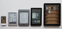 An e-reader, also called an e-book reader or e-book device, is a mobile electronic device that is designed primarily for the purpose of reading e-books and digital periodicals. An e-reader is similar in form, but more limited in purpose than a tablet. In comparison to tablets, many e-readers are better than tablets for reading because they are more portable, have better readability in sunlight and have longer battery life.[52] In July 2010, online bookseller Amazon.com reported sales of e-books for its proprietary Kindle, outnumbered sales of hardcover books for the first time ever during the second quarter of 2010, saying it sold 140 e-books for every 100 hardcover books, including hardcovers for which there was no digital edition.[53] By January 2011, e-book sales at Amazon had surpassed its paperback sales.[54] In the overall US market, paperback book sales are still much larger than either hardcover or e-book. The American Publishing Association estimated e-books represented 8.5% of sales as of mid-2010, up from 3% a year before.[55] At the end of the first quarter of 2012, e-book sales in the United States surpassed hardcover book sales for the first time.[5]