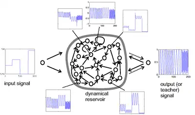 Schiller and Steil[7] also demonstrated that in conventional training approaches for RNNs, in which all weights (not only output weights) are adapted, the dominant changes are in output weights. In cognitive neuroscience, Peter F. Dominey analysed a related process related to the modelling of sequence processing in the mammalian brain, in particular speech recognition in the human brain.[8] The basic idea also included a model of temporal input discrimination in biological neuronal networks.[9] An early clear formulation of the reservoir computing idea is due to K. Kirby, who disclosed this concept in a largely forgotten conference contribution.[10] The first formulation of the reservoir computing idea known today stems from L. Schomaker,[11] who described how a desired target output could be obtained from an RNN by learning to combine signals from a randomly configured ensemble of spiking neural oscillators.[2]