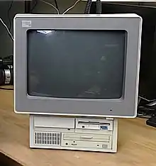 EduQuest's first computer system was the PS/2 Model 25 SX, an update to the Model 25 all-in-one offering within IBM's PS/2 line of personal computers that upgraded the processor to an i386SX.[11] The PS/2 Model 25 SX was developed shortly before the formation of EduQuest, in IBM's Boca Raton facility, led by José García.[12] EduQuest's later computer systems were still based on the Model 25 form factor but broke away from the PS/2 branding. In 1993, they introduced the Model Thirty, Model Forty, and Model Fifty. School district technology departments could order these models with adjustments to the hardware such as the networking capability (token ring, Ethernet or none at all); the amount of RAM; the presence of sound card; the size of the hard disk drive; and whether to install the optional CD-ROM drive. EduQuest developed the systems to withstand the rigors of elementary and secondary school use through physically attaching the mouse to the system chassis and making the mouse unable to be tampered with to remove the roller ball; covering the floppy drive with a dust shield to prevent chalk dust and dirt from gumming up the internals; and a special optional keyboard with a built-in trackball.[13] In May 1994, EduQuest introduced the Model Thirty-five and Model Fifty-Five, featuring upgraded processors.[14] The Easton Area School District purchased 1,418 of these Models in November 1994.[15]