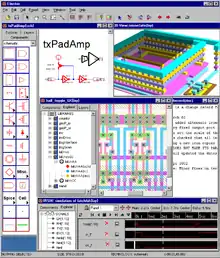 The Electric VLSI Design System is an EDA tool written in the early 1980s by Steven M. Rubin.[3][4][5] Electric is used to construct logic wire schematics and to perform analysis of integrated circuit layout. It can also handle hardware description languages such as VHDL and Verilog. The system has many analysis and synthesis tools, including design rule checking, simulation, routing, Layout vs. Schematic, logical effort, and more.