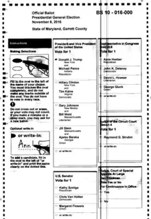 - In a 2016 Maryland election, a comparison of two scanning systems on the same ballots revealed that (a) 1,972 ballot images were incorrectly left out of one system, (b) one system incorrectly ignored many votes for write-in candidates,[41] (c) shadows from paper folds were sometimes interpreted as names written in on the ballot, (d) the scanner sometimes pulled two ballots at once, scanning only the top one, (e) the ballot printers sometimes left off certain candidates, (f) voters often put a check or X instead of filling in an oval, which software has to adapt to, and (g) a scratch or dirt on a scanner sensor put a black line on many ballot images, causing the appearance of voting for more than the allowed number of candidates, so those votes were incorrectly ignored.[18][19]