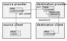 - Faircloth 2013, p. 51: "SMTP is comprised of a mail submission agent (MSA), a mail user agent (MUA), a mail retrieval agent (MRA), a mail exchanger (MX), a mail delivery agent (MDA), and potentially multiple servers in between known as mail transfer agents (MTAs)."