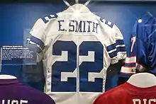 The Cowboys selected Smith in the first round of the 1990 NFL draft with the 17th overall pick. During his long professional career, he rushed for 18,355 yards, breaking the record formerly held by Walter Payton. He also holds the record for career rushing touchdowns with 164.[1] Smith is the only running back to ever win a Super Bowl championship, the NFL Most Valuable Player award, the NFL rushing crown, and the Super Bowl Most Valuable Player award all in the same season (1993). He is also one of four running backs to lead the NFL in rushing three or more consecutive seasons, joining Steve Van Buren, Jim Brown, and Earl Campbell. Smith led the league in rushing and won the Super Bowl in the same year three times (1992, 1993, and 1995) when to that point it had never been done. Smith is also one of only two non-kickers in NFL history to score more than 1,000 career points (the other being Jerry Rice). Smith was inducted to the Pro Football Hall of Fame in 2010 and the College Football Hall of Fame in 2006.