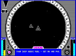 The player can navigate his ship onto a planet's surface through a warp hole (and a tunnel-maneuvering subgame). Once there, three different supplies can be collected in a first-person flight subgame. The three supplies – people, minerals and radioactives – are then made available for pick-up in the main playing area and can be transferred back to the starbase.