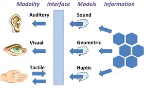 Enactive interfaces are interactive systems that allow organization and transmission of knowledge obtained through action. Examples are interfaces that couple a human with a machine to do things usually done unaided, such as shaping a three-dimensional object using multiple modality interactions with a database,[2] or using interactive video to allow a student to visually engage with mathematical concepts.[3] Enactive interface design can be approached through the idea of raising awareness of affordances, that is, optimization of the awareness of possible actions available to someone using the enactive interface.[4] This optimization involves visibility, affordance, and feedback.[5][6]