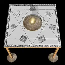- The Holy Table: a table with a top engraved with a Hexagram, a surrounding border of Enochian letters, and in the middle a Twelvefold table (cell) engraved with individual Enochian letters. According to Duquette and Hyatt, the Holy Table "does not directly concern Elemental or Aethyrical workings. Angels found on the Holy Table are not called forth in these operations."[31]