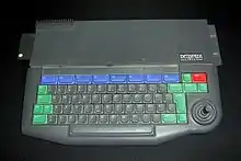 The case is unusual in that it contains both a full-sized keyboard with programmable function keys, and a joystick. Its distinctive shape was due to the designers' desire to break away from customary designs.[6] The low-profile keyboard is constructed with mechanical keycaps on top of a rubber membrane and has a standard layout, but the feel of the keys was disliked by many, or even most people, because the keys weren't "full travel", but had a squishy feel, similar to a Sinclair QL or Spectrum+. The joystick replaces the normal cursor keys, and allows the cursor to be moved diagonally.