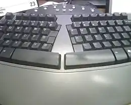 Ergonomic split keyboards can be fixed, where the user cannot change the relative angles and distance between the sections, or adjustable, which usually has two independent modules that allow these to be tailored exactly to the user. Fixed split keyboards are necessarily designed to accommodate a wide range of users, and can be set up rapidly to replicate a similar interface in different settings, but may not fit a specific user exactly. For example, people with broad shoulders may benefit from an adjustable split keyboard's ability to customize the distance between the two halves of the keyboard. This ensures the elbows are not too close together when typing.[7] On the other hand, adjustable split keyboards sometimes intimidate potential users, who may fear they may exacerbate or become more susceptible to repetitive strain injuries; fixed split keyboards like the Microsoft Natural have sold well in comparison.[8]