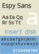 Espy Sans is a bitmap font designed by Garrett Boge and Damon Clark of LetterPerfect Fonts for the Apple Computer user interface group in 1992. The Espy family, consisting of Sans & Serif, Regular & Bold in discrete bitmap sizes of 8, 9, 10, 12 & 14 pt, replaced Apple's previous use of Chicago and Geneva in Mac OS 7.5 released in 1995. It was also used for the Newton PDA project and their eWorld online bulletin board service. It was later adapted for use in the Apple Guide help system and some versions of the iPod, particularly the iPod mini. Before the release of the Charcoal font used for Mac OS 8 and 9, it was a popular replacement system font for reskinnings of Mac OS 7.x, being included in system extensions such as Greg Landweber's Aaron extension.