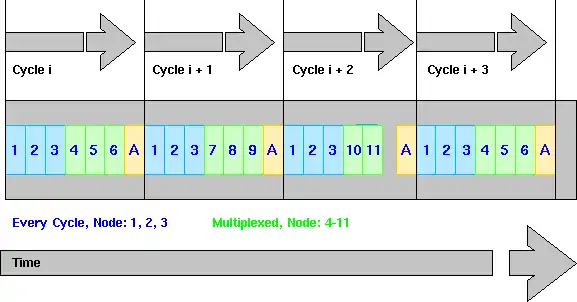 In addition to transferring isochronous data during each basic cycle, some nodes are also able to share transfer slots for better bandwidth utilization. For that reason, the isochronous phase can distinguish between transfer slots dedicated to particular nodes, which have to send their data in every basic cycle, and slots shared by nodes to transfer their data one after the other in different cycles. Therefore, less important yet still time-critical data can be transferred in longer cycles than the basic cycle. Assigning the slots during each cycle is at the discretion of the Managing Node.