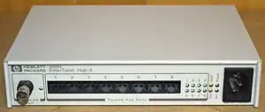 An Ethernet hub, active hub, network hub, repeater hub, multiport repeater, or simply hub[lower-alpha 1] is a network hardware device for connecting multiple Ethernet devices together and making them act as a single network segment. It has multiple input/output (I/O) ports, in which a signal introduced at the input of any port appears at the output of every port except the original incoming.[1] A hub works at the physical layer.[2] A repeater hub also participates in collision detection, forwarding a jam signal to all ports if it detects a collision. In addition to standard 8P8C ("RJ45") ports, some hubs may also come with a BNC or an Attachment Unit Interface (AUI) connector to allow connection to legacy 10BASE2 or 10BASE5 network segments.