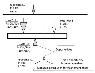 - Time-dependent global risks, or risks affecting activities running during certain period time, would have a vertical dashed line, associated with them. Statistical distribution for moment of risk can be shown around that arrow, representing time-dependent global risk.