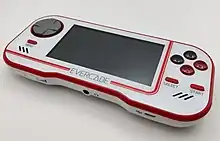 Blaze Entertainment developed 20 versions of the Evercade D-pad before settling on a final version. The design is based on the D-pads featured on the Genesis and Saturn controllers.[2] Aside from the D-pad, the console includes four action buttons on the front and two trigger buttons on top. It also has "menu", "select" and "start" buttons.[24] The layout of the four action buttons was determined after Blaze conducted an online poll, which found that 68 percent of people wanted a layout like those used on modern game controllers. However, this created confusion, as in-game prompts never match the buttons (a player may need to press "B" when prompted to press "A"). As the console launched, Blaze released a firmware update for the layout issue,[2][25] requiring the user to connect the console through USB to the Evercade website.[26]