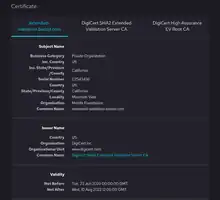In May 2018, Google announced plans to redesign user interfaces of Google Chrome to remove emphasis for EV certificates.[5] Chrome 77, released in 2019, removed the EV certificate indication from omnibox, but EV certificate status can be viewed by clicking on lock icon and then checking for legal entity name listed as "issued to" under "certificate".[6] Firefox 70 removed the distinction in the omnibox or URL bar (EV and DV certificates are displayed similarly with just a lock icon), but the details about certificate EV status are accessible in the more detailed view that opens after click on the lock icon.[7]