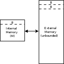 The model consists of a processor with an internal memory or cache of size M, connected to an unbounded external memory. Both the internal and external memory are divided into blocks of size B. One input/output or memory transfer operation consists of moving a block of B contiguous elements from external to internal memory, and the running time of an algorithm is determined by the number of these input/output operations.[4]
