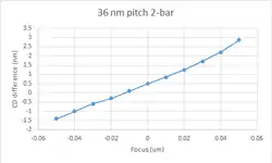 An extension of the two-bar case to a grating consisting of many horizontal lines shows similar sensitivity to defocus.[75] It is manifest in the critical dimension (CD) difference between the top and bottom edge lines of the set of 11 horizontal lines.