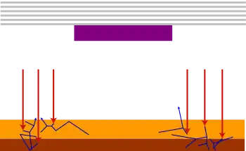 A fundamental aspect of EUVL tools, resulting from the use of reflective optics, is the off-axis illumination (at an angle of 6 degrees, in different direction at different positions within the illumination slit)[68] on a multilayer mask (reticle). This leads to shadowing effects resulting in asymmetry in the diffraction pattern that degrade pattern fidelity in various ways as described below.[69][70] For example, one side (behind the shadow) would appear brighter than the other (within the shadow).[71]