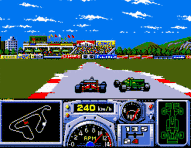 The difficulty level can be set, the race track selected and the number of laps is variable. The field includes ready made and custom made cars (the player can select engine, tires, suspension). Avoiding the slower cars the player come up to lap can be crucial. During a race, the players can bump into other cars and into the side boards and other obstacles, but this will damage the player's car. In every track, there is a pit lane (labeled with the letters "PIT") where the players can fuel up and repair the car. Top speed will decrease if the engine is damaged and the players will lose time in every lap. When they are in the PIT STOP they can hold down the DOWN key to speed up car repairs, but the fuel intake will be slower. The fuel consumption is determined by the RPM meter (as in real car). F1 tracks cannot be won at the first race unless they become an ace driver. To win an F1 race, they must memorize each curve and play each race several times to know where to brake and where to accelerate.