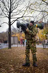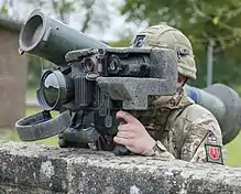 The missile is ejected from the launcher to a safe distance from the operator before the main rocket motors ignite – a "soft launch arrangement".[17] This makes it harder to identify the launcher, though backblast from the launch tube still poses a hazard to nearby personnel. The firing team may move as soon as the "fire-and-forget" missile has been launched, or immediately prepare to fire on their next target.[18] The missile system is sometimes carried by two soldiers consisting of a gunner and an ammunition bearer, although one soldier can fire it. While the gunner aims and fires the missile, the ammunition bearer scans for prospective targets, watches for threats like enemy vehicles or troops and ensures that personnel and obstacles are clear of the missile's launch backblast.