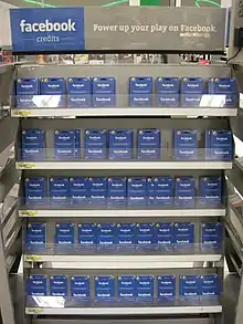 Facebook Credits was a virtual currency that enabled people to purchase items in games and non-gaming applications on the Facebook Platform. One U.S. dollar was the equivalent of 10 Facebook Credits.[1] Facebook Credits were available in 15 currencies including U.S. dollars, pound sterling, euros, and Danish kroner.[2] Facebook was hoping eventually to expand Credits into a micropayment system open to any Facebook application, whether a game or a media company application.[3] Facebook deprecated Credits in favour of users' local currencies.[4][5]