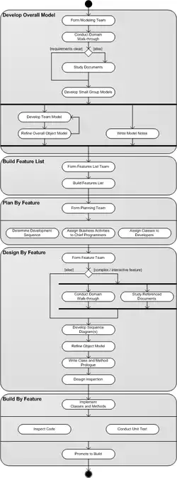 FDD is a model-driven short-iteration process that consists of five basic activities. For accurate state reporting and keeping track of the software development project, milestones that mark the progress made on each feature are defined. This section gives a high-level overview of the activities. In the figure on the right, the meta-process model for these activities is displayed. During the first two sequential activities, an overall model shape is established. The final three activities are iterated for each feature.
