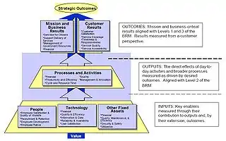 The PRM uses a number of existing approaches to performance measurement, including the Balanced Scorecard, Baldrige Criteria,[6] value measuring methodology, program logic models, the value chain, and the Theory of Constraints. In addition, the PRM was informed by what agencies are currently measuring through PART assessments, GPRA, enterprise architecture, and Capital Planning and Investment Control. The PRM is currently composed of four measurement areas: