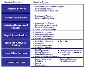 Each Service Domain is decomposed into Service Types. For example, the three Service Types associated with the Customer Services Domain are: Customer Preferences; Customer Relationship Management; and Customer Initiated Assistance. And each Service Type is decomposed further into components. For example, the four components within the Customer Preferences Service Type include: Personalization; Subscriptions; Alerts and Notifications; and Profile Management.[7]