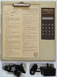 The Ferranti Market Research Terminal (MRT) was, arguably, the world’s first application-specific handheld computer.[1][2] It was designed specifically for the market research sector as a means to augment the regular clipboard schemes that, at the time, were common-place, in social and market research.[3] Despite having an appearance of a calculator built into a clipboard, the reality was that the unit contained a sophisticated form of programmable data-logger that, in response to an interviewer reading questions to the interviewee, had answers digitally recorded (for later uploading and analysis) via pressing appropriate keys on the unit. The unit contained a bespoke operating system to support field based market research. The Ferranti Market Research Terminal (MRT) is also of historical significance to the computing industry since it marked the last original computer design from Ferranti, a long established business (started 1882) that had risen to fame through a collaboration Manchester University to produce the "Mark 1", the world’s first commercial computer and later with Cambridge University producing the "Atlas" and "Titan" computers which, at their peak, held around 25% of the computing market.