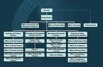 As of November 2013, FinCEN employed approximately 340 people, mostly intelligence professionals with expertise in the financial industry, illicit finance, financial intelligence, the AML/CFT (anti-money laundering / combating the financing of terrorism) regulatory regime, computer technology, and enforcement".[2] The majority of the staff are permanent FinCEN personnel, with about 20 long-term detailees assigned from 13 different regulatory and law enforcement agencies.[6] FinCEN shares information with dozens of intelligence agencies, including the Bureau of Alcohol, Tobacco, and Firearms; the Drug Enforcement Administration; the Federal Bureau of Investigation; the U.S. Secret Service; the Internal Revenue Service; the Customs Service; and the U.S. Postal Inspection Service.