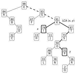 A treap is a randomized binary search tree (BST). Searching in a treap is the same as searching for an element in any other BST. Treaps however have the property that the expected path length between two elements of distance d is O(log d). Thus, to finger search from the node containing y for x, one can climb the tree from y until an ancestor of x is found, at which point normal BST search proceeds as usual. While determining if a node is the ancestor of another is non-trivial, one may augment the tree to support queries of this form to give expected O(log d) finger search time.[1]