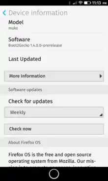 - "[ROM][OCT 11] FirefoxOS 1.2 and 1.3". XDA Developers. October 11, 2013. Archived from the original on December 11, 2014. Retrieved December 6, 2014.