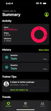 All workouts recorded through the Workouts app on the Apple Watch are viewable through the 'Summary' tab of the Fitness app and include relevant metrics and HealthKit data, such as heart rate, depending on the type of exercise. For outdoor activities, summaries also include weather conditions at the time of the workout and a map that outlines the route taken while exercising. Since iOS 15, a record of mindfulness activities can also be viewed from the summary tab. After a 180-day period, the app will also begin to show users their exercise trends averaged over the present and past rolling 90-day windows, displaying arrows next to various metrics.[4] Arrows which are facing up show an improvement in an area, whereas downwards facing arrows show a decline.