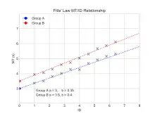 - a and b are constants that depend on the choice of input device and are usually determined empirically by regression analysis. a defines the intersection on the y axis and is often interpreted as a delay. The b parameter is a slope and describes an acceleration. Both parameters show the linear dependency in Fitts's law.[10]