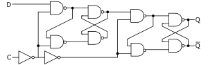 This circuit[26] consists of two stages implemented by SR NAND latches. The input stage (the two latches on the left) processes the clock and data signals to ensure correct input signals for the output stage (the single latch on the right). If the clock is low, both the output signals of the input stage are high regardless of the data input; the output latch is unaffected and it stores the previous state. When the clock signal changes from low to high, only one of the output voltages (depending on the data signal) goes low and sets/resets the output latch: if D = 0, the lower output becomes low; if D = 1, the upper output becomes low. If the clock signal continues staying high, the outputs keep their states regardless of the data input and force the output latch to stay in the corresponding state as the input logical zero (of the output stage) remains active while the clock is high. Hence the role of the output latch is to store the data only while the clock is low.