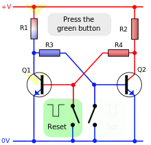 - ↑ Alternatively, the two inputs may be called set 1 and set 0, which may clear confusion for some: the term set alone may be misunderstood as setting the bit to the input provided to set. This naming also makes it intuitive in the explanation below that trying to set 0 and 1 at the same time should make the SR latch behave unpredictably.