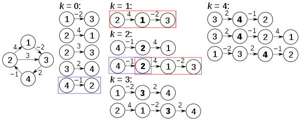 Prior to the first recursion of the outer loop, labeled k = 0 above, the only known paths correspond to the single edges in the graph. At k = 1, paths that go through the vertex 1 are found: in particular, the path [2,1,3] is found, replacing the path [2,3] which has fewer edges but is longer (in terms of weight). At k = 2, paths going through the vertices {1,2} are found. The red and blue boxes show how the path [4,2,1,3] is assembled from the two known paths [4,2] and [2,1,3] encountered in previous iterations, with 2 in the intersection. The path [4,2,3] is not considered, because [2,1,3] is the shortest path encountered so far from 2 to 3. At k = 3, paths going through the vertices {1,2,3} are found. Finally, at k = 4, all shortest paths are found.