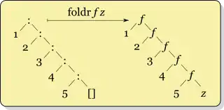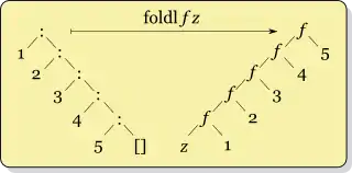 These pictures illustrate right and left fold of a list visually. They also highlight the fact that foldr (:) [] is the identity function on lists (a shallow copy in Lisp parlance), as replacing cons with cons and nil with nil will not change the result. The left fold diagram suggests an easy way to reverse a list, foldl (flip (:)) []. Note that the parameters to cons must be flipped, because the element to add is now the right hand parameter of the combining function. Another easy result to see from this vantage-point is to write the higher-order map function in terms of foldr, by composing the function to act on the elements with cons, as:
