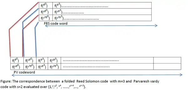 unlike in the folded FRS encoding in which it appears only once. Thus, the PV and folded RS codes have same information but only the rate of FRS is bigger by a factor of and hence the list decoding radius trade-off is better for folded RS code by just using the list decodability of the PV codes. The plus point is in choosing FRS code in a way that they are compressed forms of suitable PV code with similar error correction performance with better rate than corresponding PV code. One can use this idea to construct a folded RS codes of rate that are list decodable up to radius approximately for .