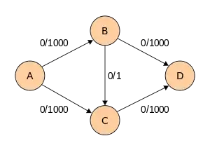 The following example shows the first steps of Ford–Fulkerson in a flow network with 4 nodes, source and sink . This example shows the worst-case behaviour of the algorithm. In each step, only a flow of is sent across the network. If breadth-first-search were used instead, only two steps would be needed.