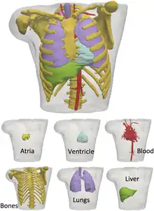 To simulate and electrocardiogram using the fully coupled or uncoupled models, a three-dimensional reconstruction of the human torso is needed. Today, diagnostic imaging techniques such as MRI and CT can provide a sufficiently accurate images that allow to reconstruct in detail anatomical human parts and, thus, obtain a suitable torso geometry. For example, the Visible Human Data[13] is a useful dataset to create a three-dimensional torso model detailed with internal organs including the skeletal structure and muscles.[1]
