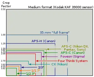 The usual size of the sensor is 18 mm × 13.5 mm (22.5 mm diagonal), with an imaging area of 17.3 mm × 13.0 mm, giving a diagonal of 21.64 mm.[17][18] The sensor's area is about 30–40% smaller than APS-C sensors used in most other DSLRs, but still around 9 times larger than the 1/2.5" sensors typically used in compact digital cameras. Incidentally, the imaging area of a Four Thirds sensor is almost identical to that of 110 film.