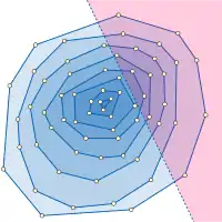 Typical applications of fractional cascading involve range search data structures in computational geometry. For example, consider the problem of half-plane range reporting: that is, intersecting a fixed set of n points with a query half-plane and listing all the points in the intersection. The problem is to structure the points in such a way that a query of this type may be answered efficiently in terms of the intersection size h. One structure that can be used for this purpose is the convex layers of the input point set, a family of nested convex polygons consisting of the convex hull of the point set and the recursively-constructed convex layers of the remaining points. Within a single layer, the points inside the query half-plane may be found by performing a binary search for the half-plane boundary line's slope among the sorted sequence of convex polygon edge slopes, leading to the polygon vertex that is inside the query half-plane and farthest from its boundary, and then sequentially searching along the polygon edges to find all other vertices inside the query half-plane. The whole half-plane range reporting problem may be solved by repeating this search procedure starting from the outermost layer and continuing inwards until reaching a layer that is disjoint from the query halfspace. Fractional cascading speeds up the successive binary searches among the sequences of polygon edge slopes in each layer, leading to a data structure for this problem with space O(n) and query time O(log n + h). The data structure may be constructed in time O(n log n) by an algorithm of Chazelle (1985). As in our example, this application involves binary searches in a linear sequence of lists (the nested sequence of the convex layers), so the catalog graph is just a path.