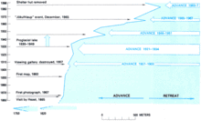 There were several periods of advance in the 20th century – 1946 to 1951 (340 m), 1965 to 1967 (400 m), 1983 to 1999 (1420 m) and 2004 to 2008 (280 m)[15] – but all were followed by periods of greater retreat.