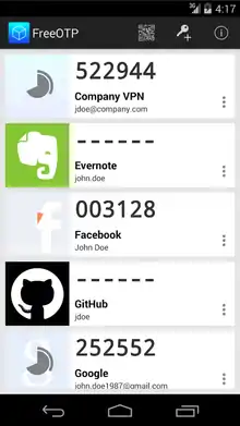 FreeOTP is a free and open-source authenticator by RedHat. It implements multi-factor authentication using HOTP and TOTP. Tokens can be added by scanning a QR code or by manually entering the token configuration. It is licensed under the Apache 2.0 license, and supports Android and iOS.[4][5][6]