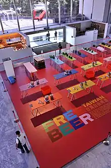 Free Beer has been distributed at technology conferences, including Summit 2008 and RMLL 2011, 2012, and 2014.[27][35] The FSCONS 2008 resulted in an ebook that featured Free Beer.[36][37] Free Beer was also exhibited in art exhibitions and museums, such as the Art Basel Miami Beach 2006, the Van Abbemuseum in the Netherlands in 2007, and the Taipei Biennial 2010.[38][4]