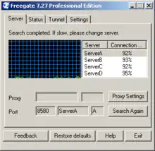 Freegate is a software application developed by Dynamic Internet Technology (DIT) that enables internet users to view websites blocked by their governments. The program takes advantage of a range of proxy servers called Dynaweb. This allows users to bypass Internet firewalls that block web sites by using DIT's Peer-to-peer (P2P)-like proxy network system.[1] FreeGate's anti-censorship capability is further enhanced by a new, unique[2] encryption and compression algorithm in the versions of 6.33 and above.[3] Dynamic Internet Technology estimates Freegate had 200,000 users in 2004.[1] The maintainer and CEO of DIT is Bill Xia.[4]