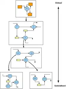 Structured Analysis and Design Technique (SADT) is a software engineering methodology for describing systems as a hierarchy of functions, a diagrammatic notation for constructing a sketch for a software application. It offers building blocks to represent entities and activities, and a variety of arrows to relate boxes. These boxes and arrows have an associated informal semantics.[21] SADT can be used as a functional analysis tool of a given process, using successive levels of details. The SADT method allows to define user needs for IT developments, which is used in industrial Information Systems, but also to explain and to present an activity's manufacturing processes, procedures.[22]