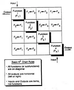 The N2 diagram has been used extensively to develop data interfaces, primarily in the software areas. However, it can also be used to develop hardware interfaces. The basic N2 chart is shown in Figure 2. The system functions are placed on the diagonal; the remainder of the squares in the N × N matrix represent the interface inputs and outputs. [20]