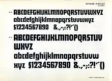 Futura is a geometric sans-serif typeface designed by Paul Renner and released in 1927.[1] It was designed as a contribution on the New Frankfurt-project. It is based on geometric shapes, especially the circle, similar in spirit to the Bauhaus design style of the period.[2][3] It was developed as a typeface by the Bauer Type Foundry (Bauersche Gießerei), in competition with Ludwig & Mayer's seminal Erbar typeface of 1926.[4][5]