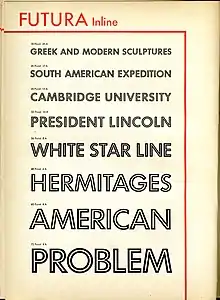 Futura was extensively marketed by Bauer Type Foundry and its American distribution arm by brochure as capturing the spirit of modernity, using the German slogan "die Schrift unserer Zeit" ("the typeface of our time") and in English "the typeface of today and tomorrow".[9][10] It has remained popular since then.[5][11]